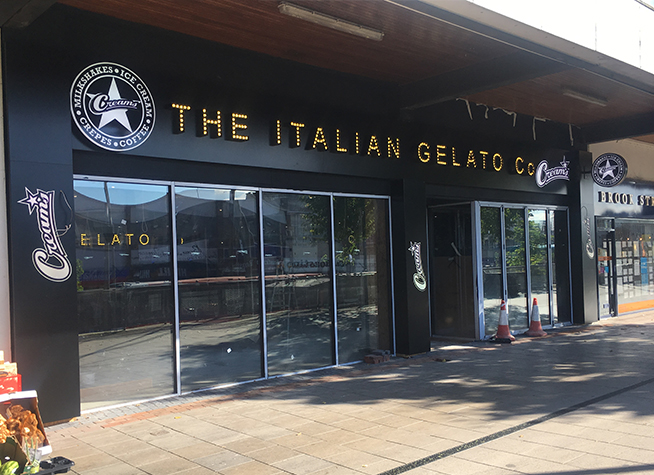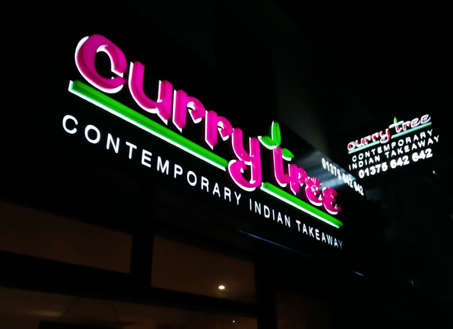 - Folded aluminium panel signs, with internal LED illumination, from within a backtray light box.